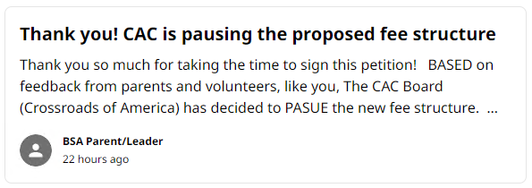 UPDATE (2023-02-12): Per the petition organizer (see photo credit below), Crossroads of America Council has pulled back on its bureaucracy-preservation fee.