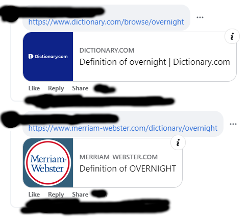 In that conversation, someone connected with national posts dictionary definitions of “overnight”. (I commented on that above.) A volunteer recognizes the definition-sharer as being connected to national. Without outing this person, that participant provides helpful feedback (top comment is the volunteer’s feedback, bottom comment is the national-affiliated person’s reply):