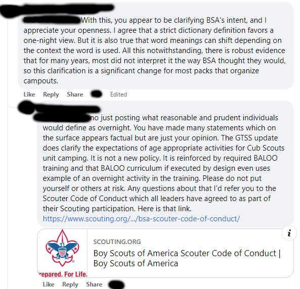 - Guide to Safe Scouting, Camping section: “Local council approval is needed for unit-coordinated overnight camping activities involving other units not chartered by the same organization.” Got it, so I can evade this requirement if I plan a two-night campout? Even more rich: This is the same document that BSA secretly revised in February 2023 to add “single” to the Cub Scout part! The very document that was revised is incoherent about the meaning of “overnight”!