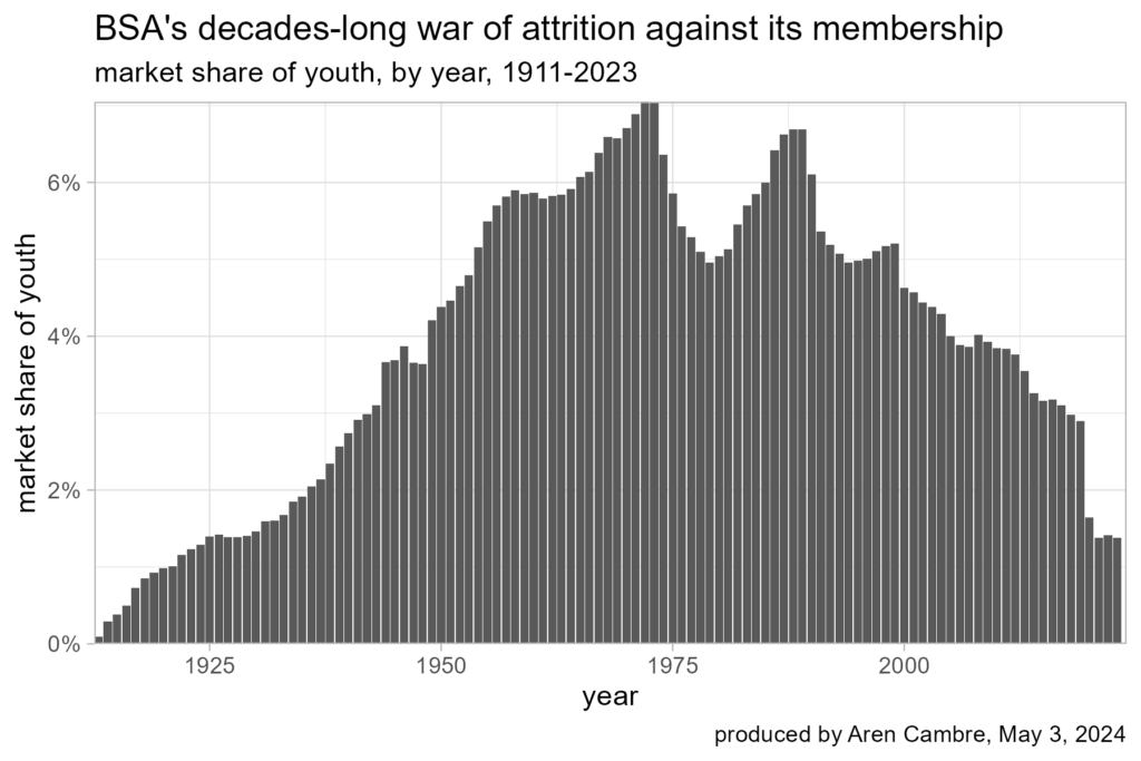 Despite 115 years of this experiment–the babysitting regime and shiny-object distractions–BSA’s “older boy youth problem” is as bad as ever. The experiment failed! Older youth remain infantilized, and their retention is as poor as always.